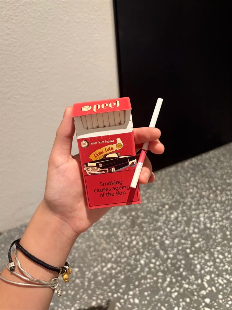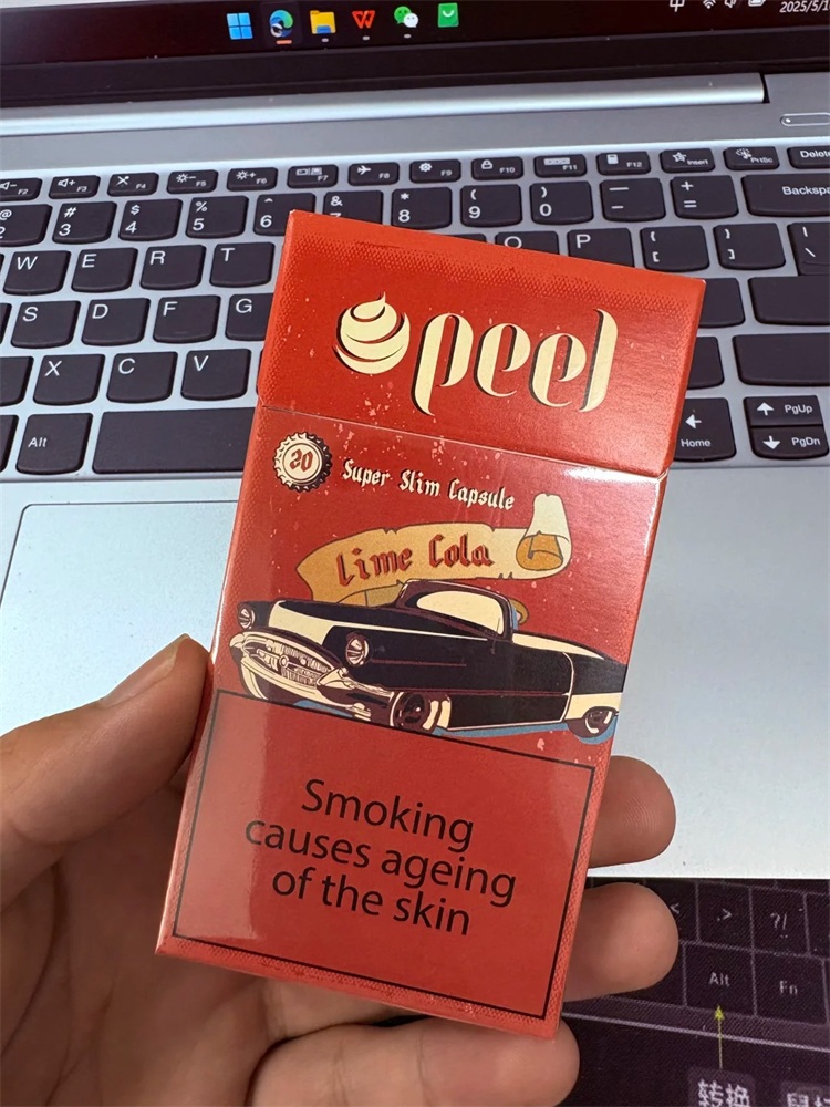 百乐可乐peel lime cola属于混合型细支爆珠香烟,焦油含量4mg,烟碱含量0.3mg,外包装烟盒主题复古汽车图案,有强烈的时代感。包装烟盖,里面有两个瓶子的图案,烟身主色调白色,烟嘴有百乐peel的LOGO,“cola”字母的标识,也就是爆珠的位置。